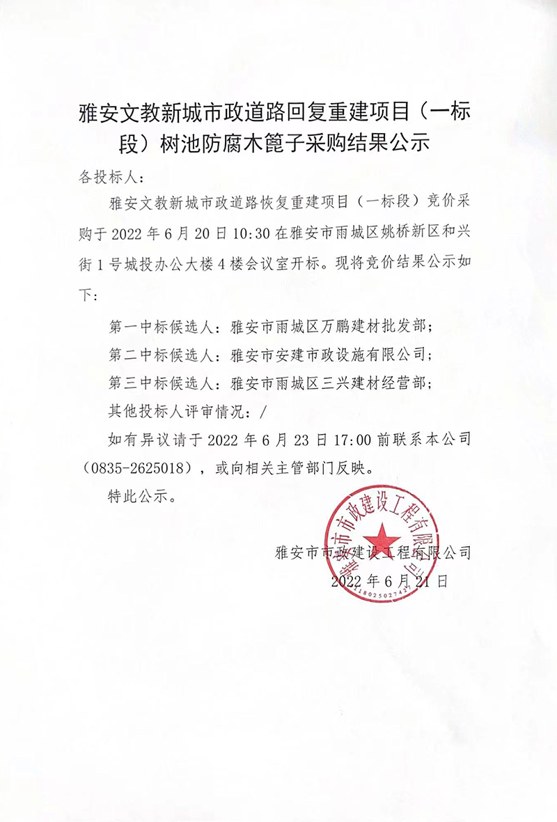 雅安市文教新城市政道路恢復(fù) 重建項(xiàng)目工程(一標(biāo)段)樹池防腐木篦子采購結(jié)果公示