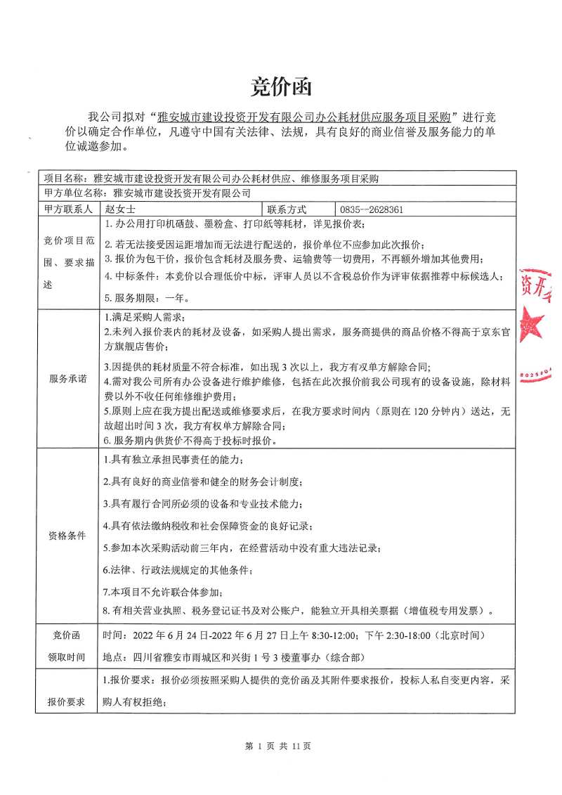 雅安城市建設(shè)投資開發(fā)有限公司 辦公耗材供應(yīng)、維修服務(wù)項目采購競價公告