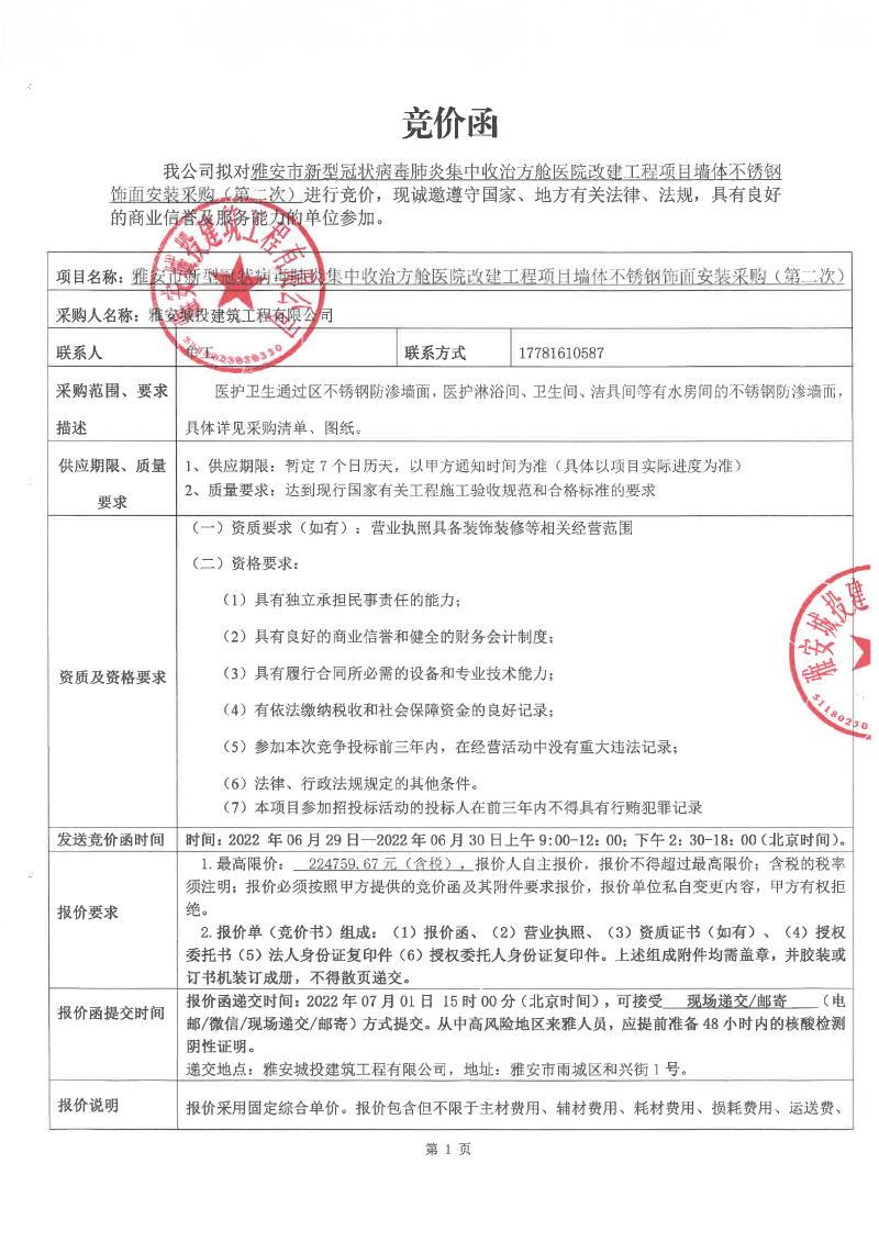 雅安市新型冠狀病毒肺炎集中收治方艙醫(yī)院改建工程項目墻體不銹鋼飾面安裝競價采購(第二次)