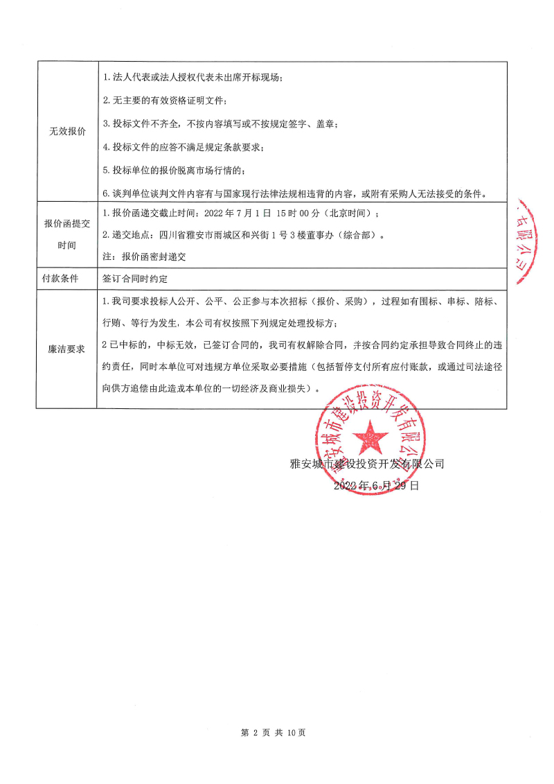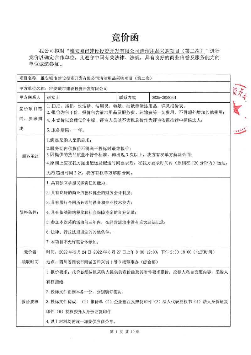 雅安城市建設(shè)投資開發(fā)有限公司 清潔用品采購項目(第二次)競價公告