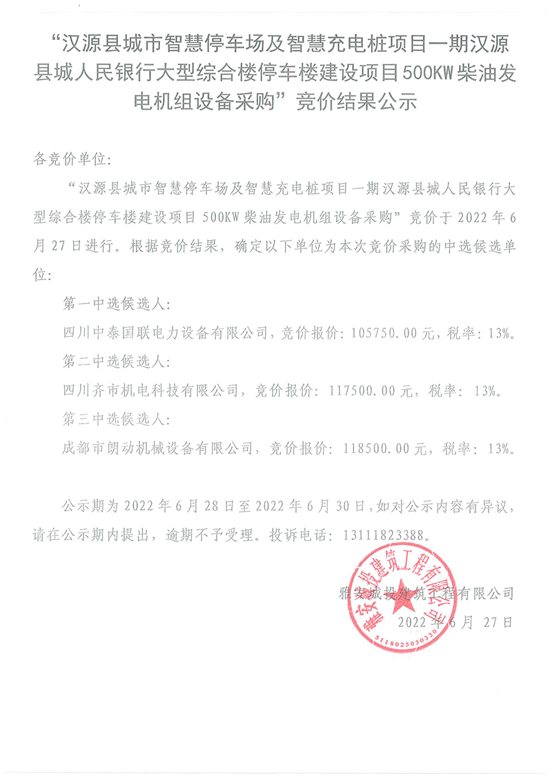 漢源縣城市智慧停車場(chǎng)及智慧充電樁項(xiàng)目一期漢源縣城人民銀行大型綜合樓停車樓建設(shè)項(xiàng)目500kw柴油發(fā)電機(jī)組設(shè)備采購競(jìng)價(jià)結(jié)果公告