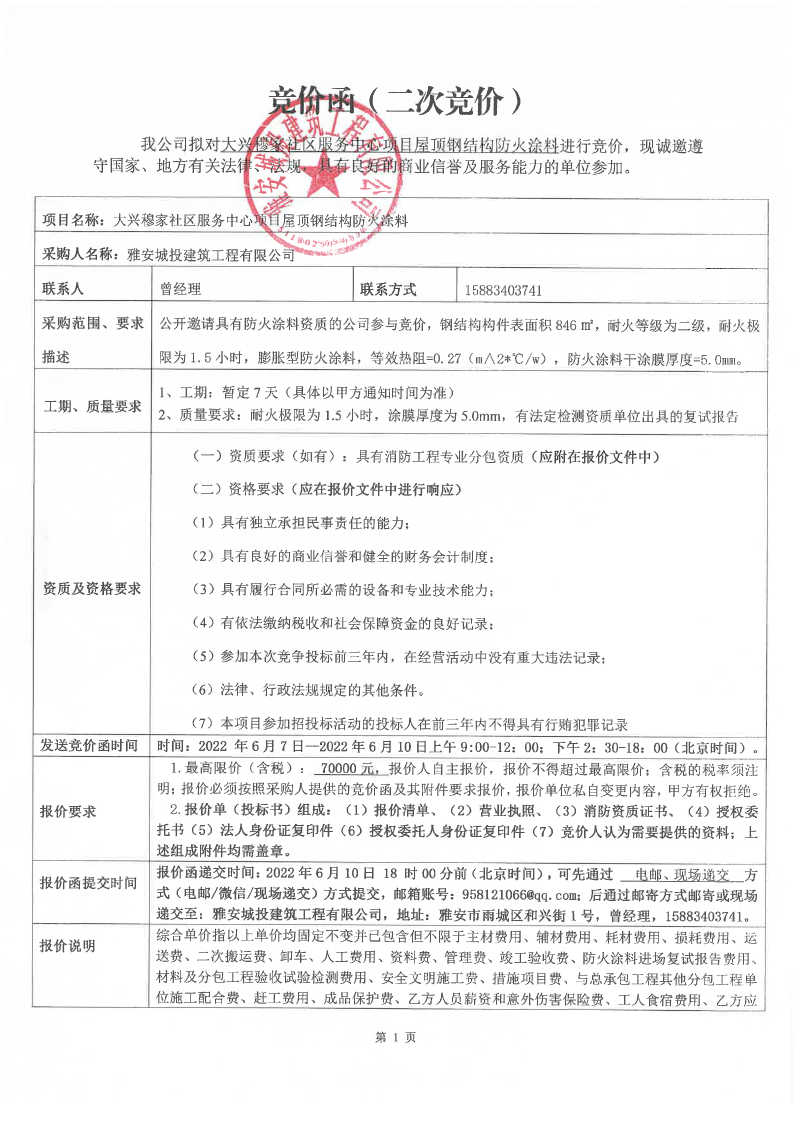 大興穆家社區(qū)服務中心項目屋頂鋼結構防火涂料競價公告