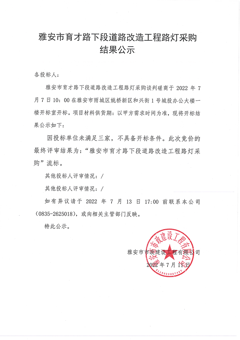 雅安市育才路下段道路改造工程路燈采購(gòu)競(jìng)價(jià)結(jié)果公示