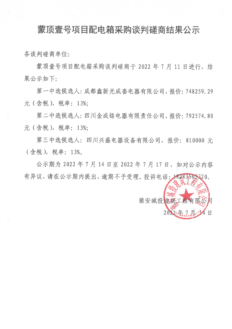 蒙頂壹號(hào)項(xiàng)目配電箱采購談判磋商結(jié)果公示