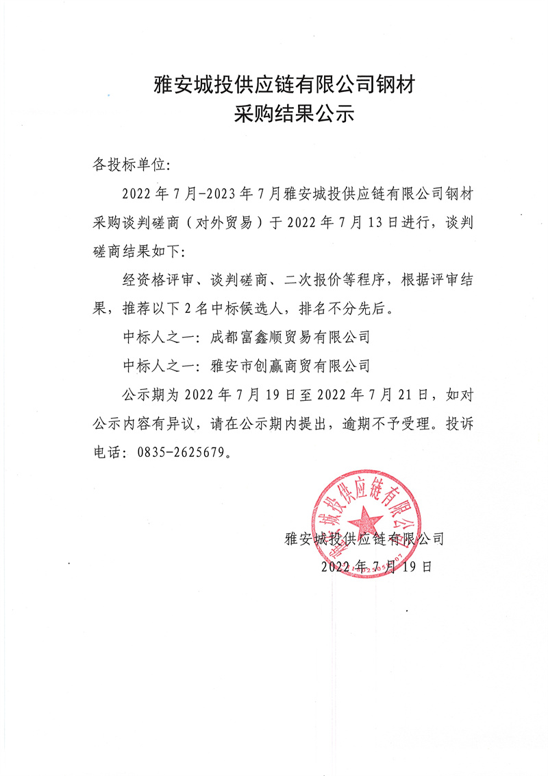 雅安城投供應(yīng)鏈有限公司鋼材采購(gòu)結(jié)果公示