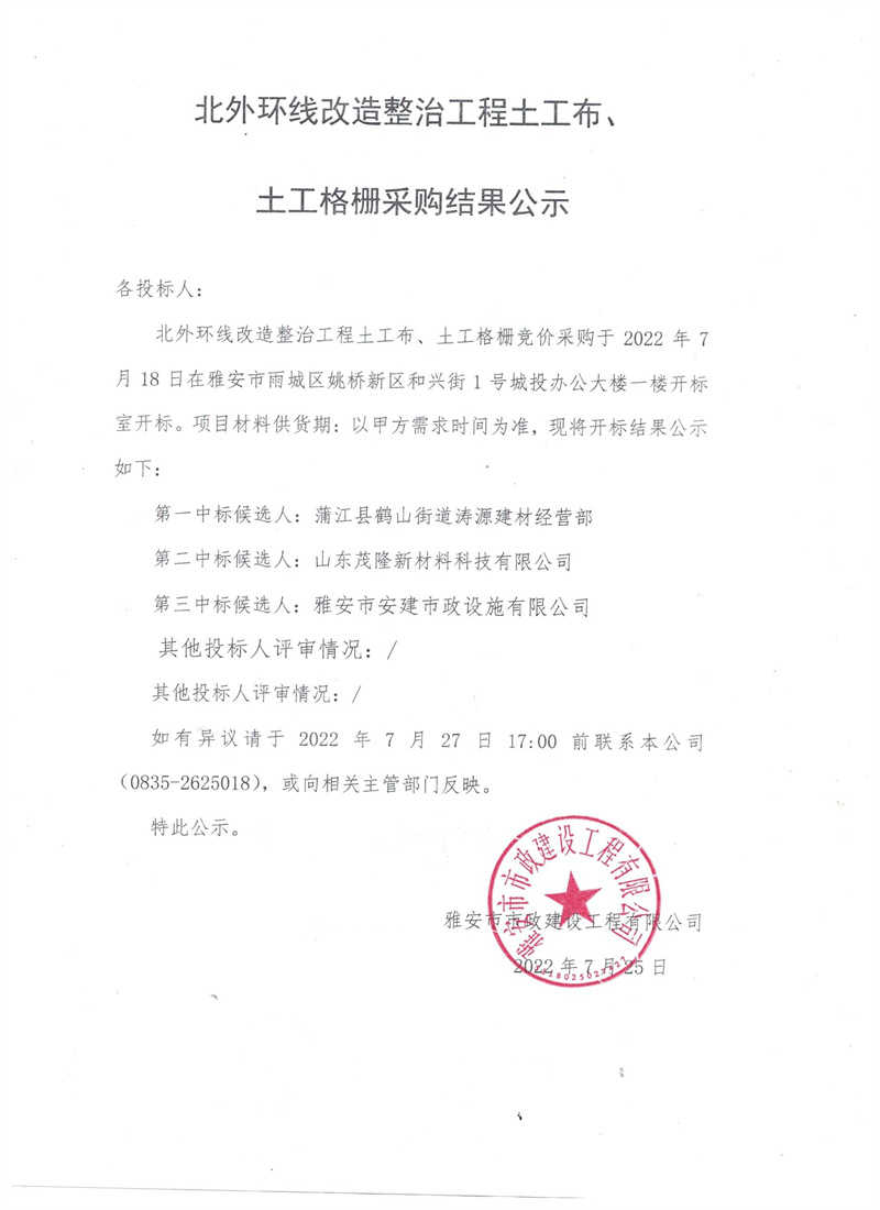 北外環(huán)線改造整治工程所需土工布、土工格柵采購(gòu)結(jié)果公示