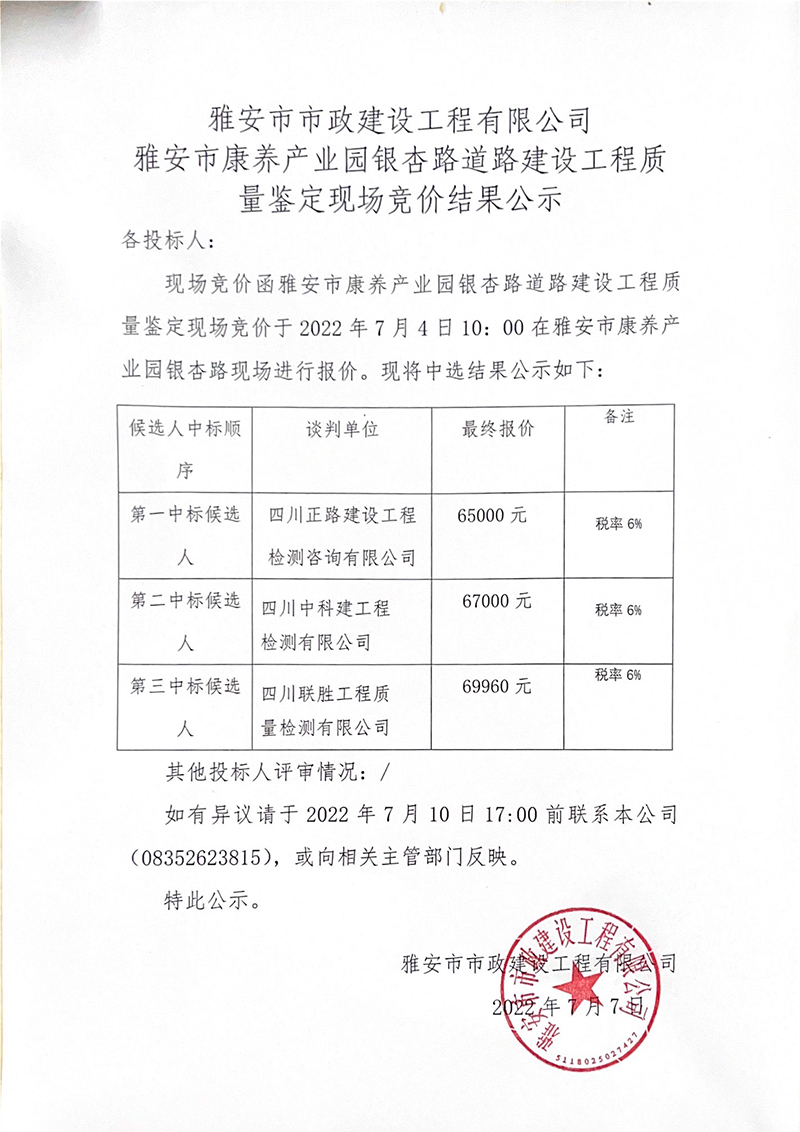 雅安市康養(yǎng)產(chǎn)業(yè)園銀杏路道路建設(shè)工程道路質(zhì)量鑒定現(xiàn)場競價(jià)公告