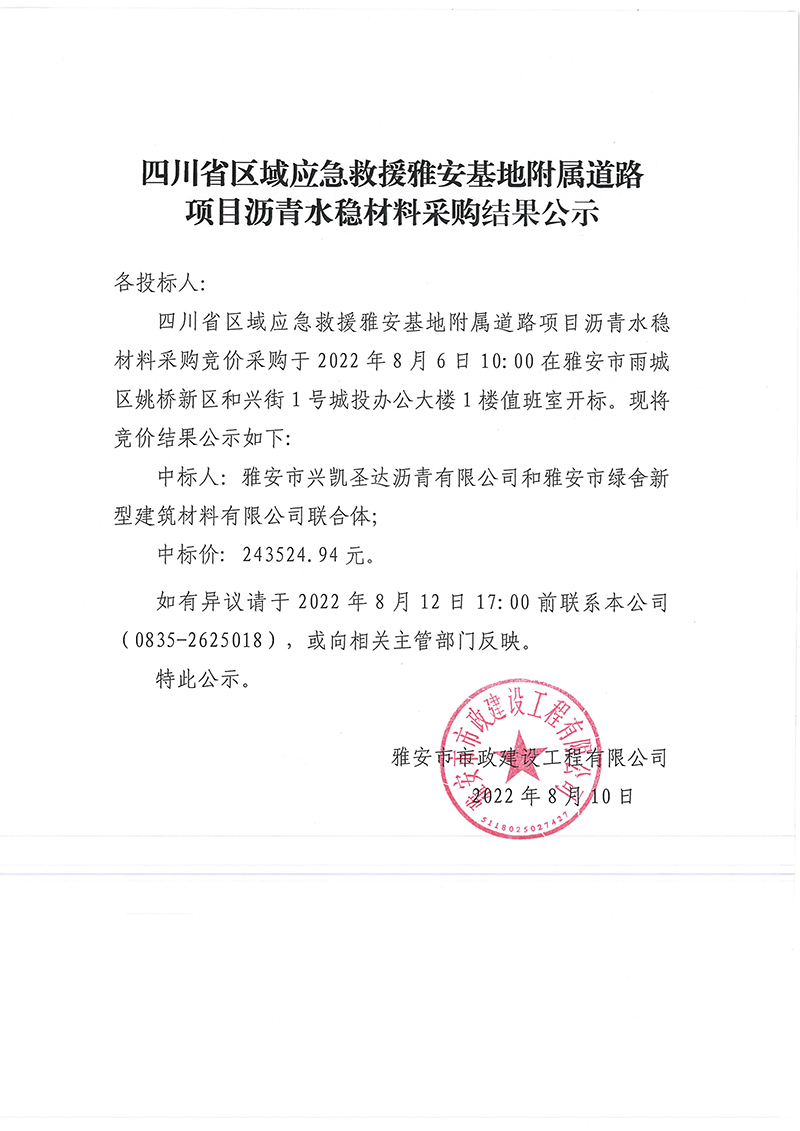 四川省區(qū)域應(yīng)急救援雅安基地附屬道路項目瀝青水穩(wěn)材料采購結(jié)果公示