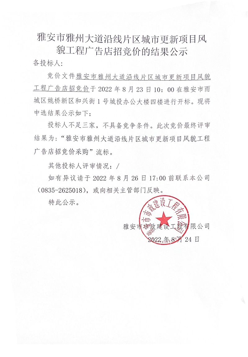 雅安市雅州大道沿線片區(qū)城市更新項目風貌工程廣告店招競價的結(jié)果公示