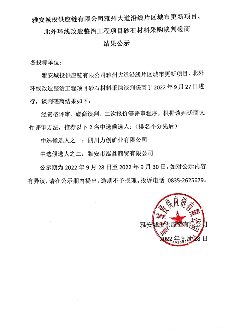 雅安城投供應(yīng)鏈有限公司雅州大道沿線片區(qū)城市更新項(xiàng)目砂石材料采購(gòu)談判磋商結(jié)果公示