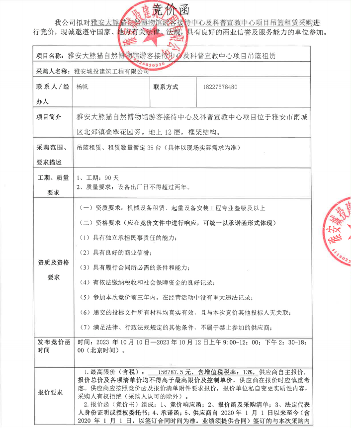 雅安大熊貓自然博物館游客接待中心及科普宣教中心項(xiàng)目吊籃租賃采購競(jìng)價(jià)公告