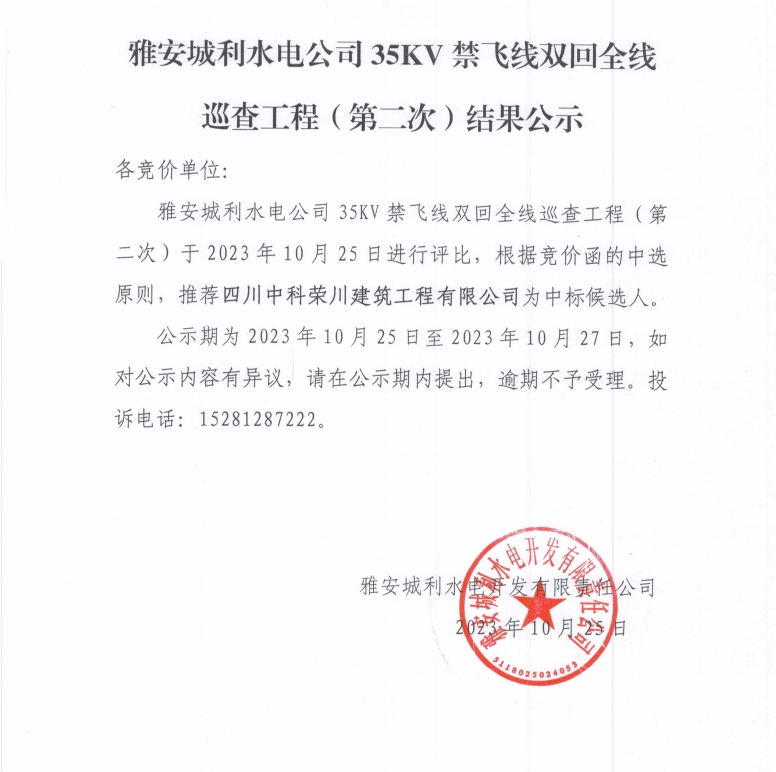 雅安城利水電公司35KV禁飛線雙回全線巡查工程(第二次)結(jié)果公示