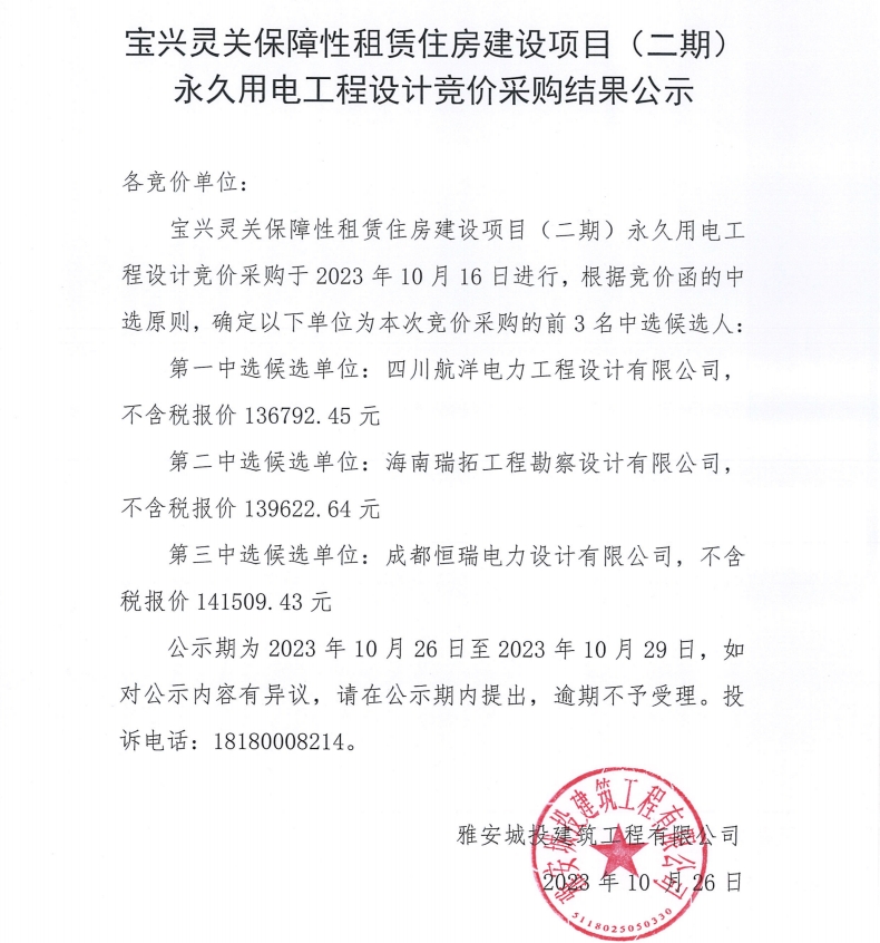 寶興靈關保障性租賃住房建設項目(二期)永久用電工程設計競價采購結果公示