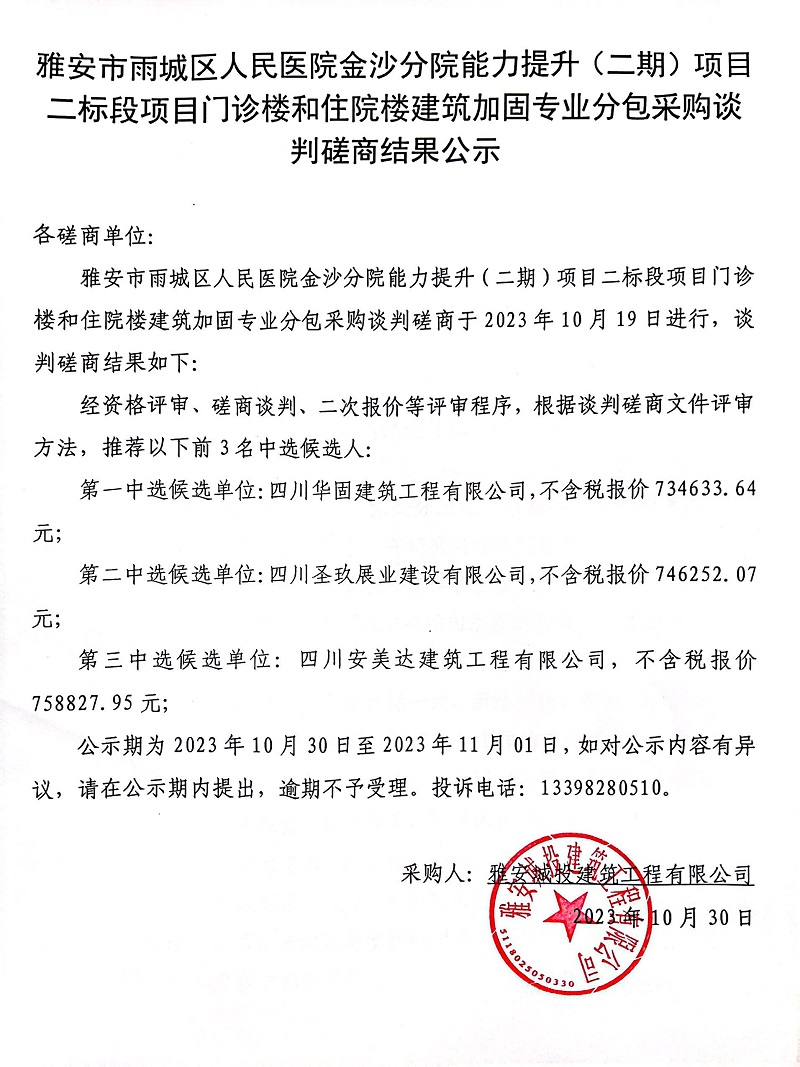 雅安市雨城區(qū)人民醫(yī)院金沙分院能力提升(二期)項目二標段門診樓和住院樓建筑加固專業(yè)分包采購談判磋商結(jié)果公示