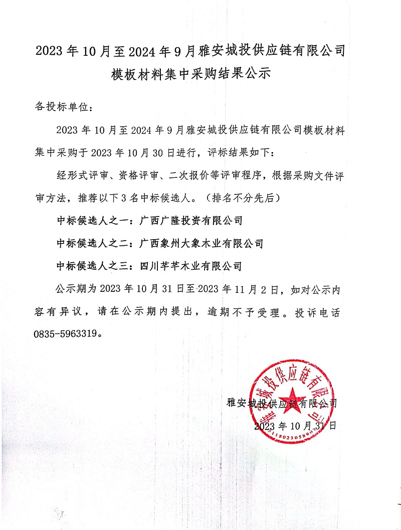 203年10月至2024年9月雅安城投供應(yīng)鏈有限公司模板材料集中采購(gòu)結(jié)果公示