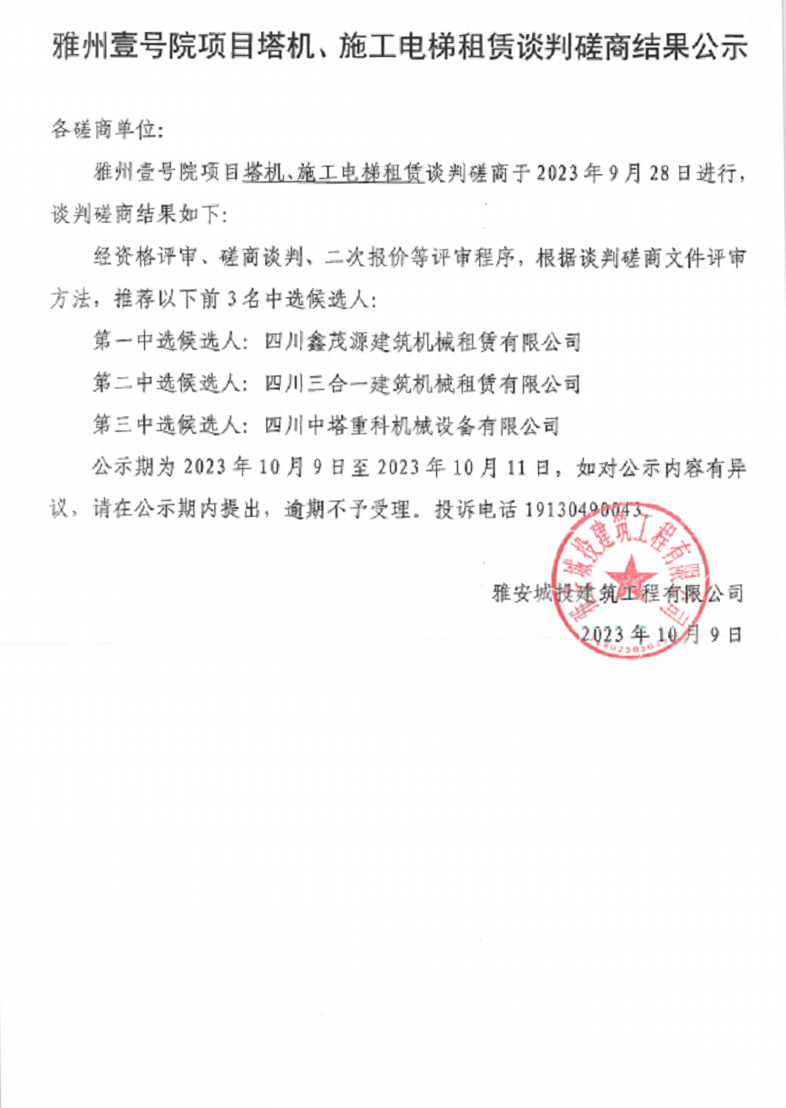 雅州壹號院項目塔機、施工電梯租賃談判磋商結果公示