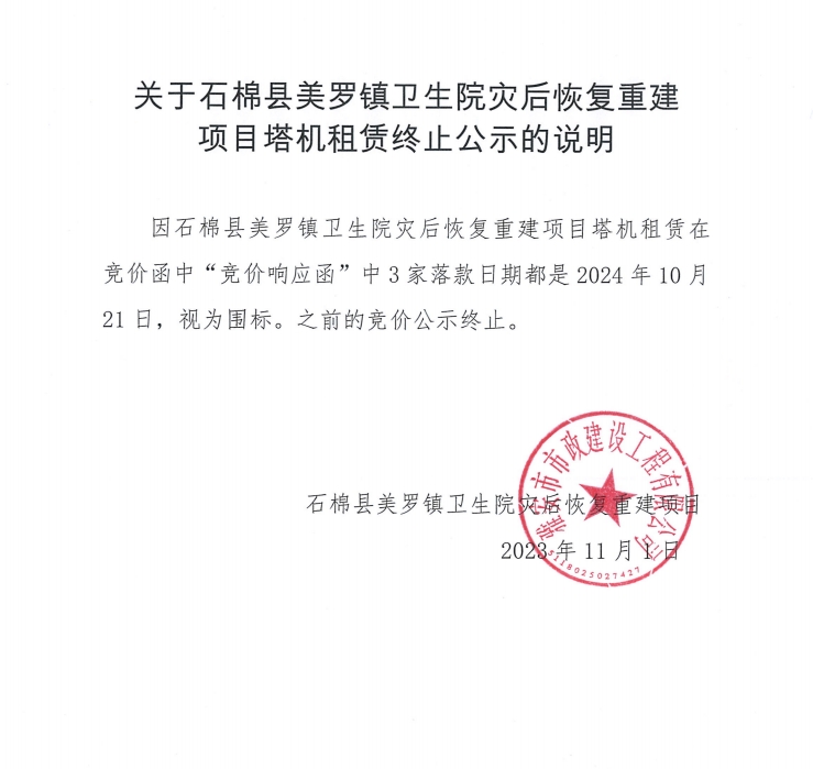 關(guān)于石棉縣美羅鎮(zhèn)衛(wèi)生院災(zāi)后恢復(fù)重建項(xiàng)目塔機(jī)租賃終止公示的說明