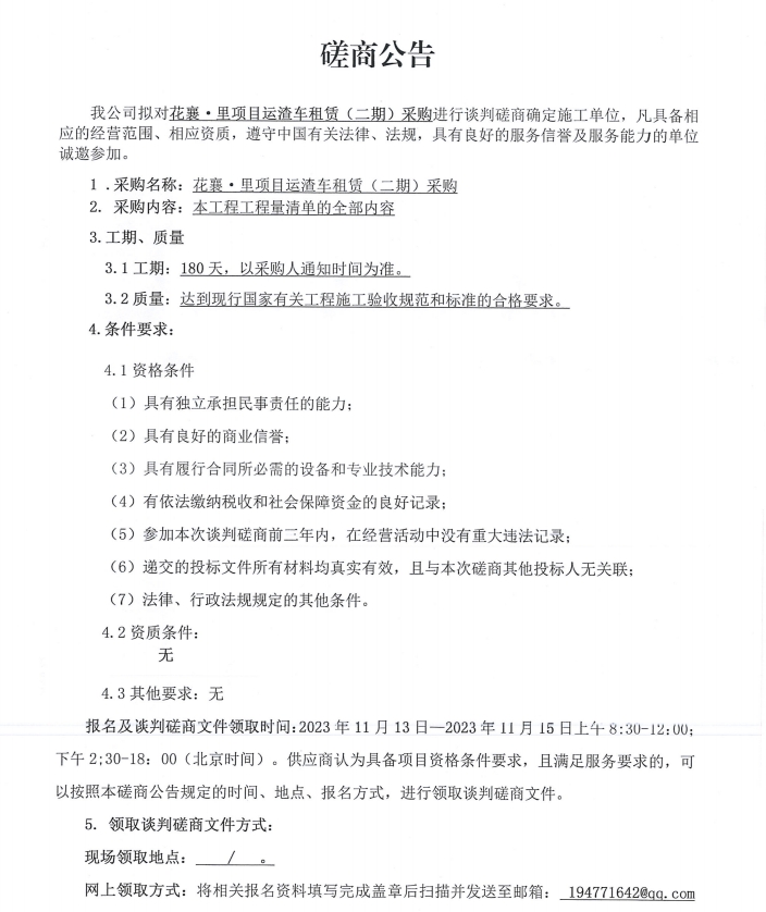 花襄·里項目運渣車租賃(二期)采購談判磋商公告