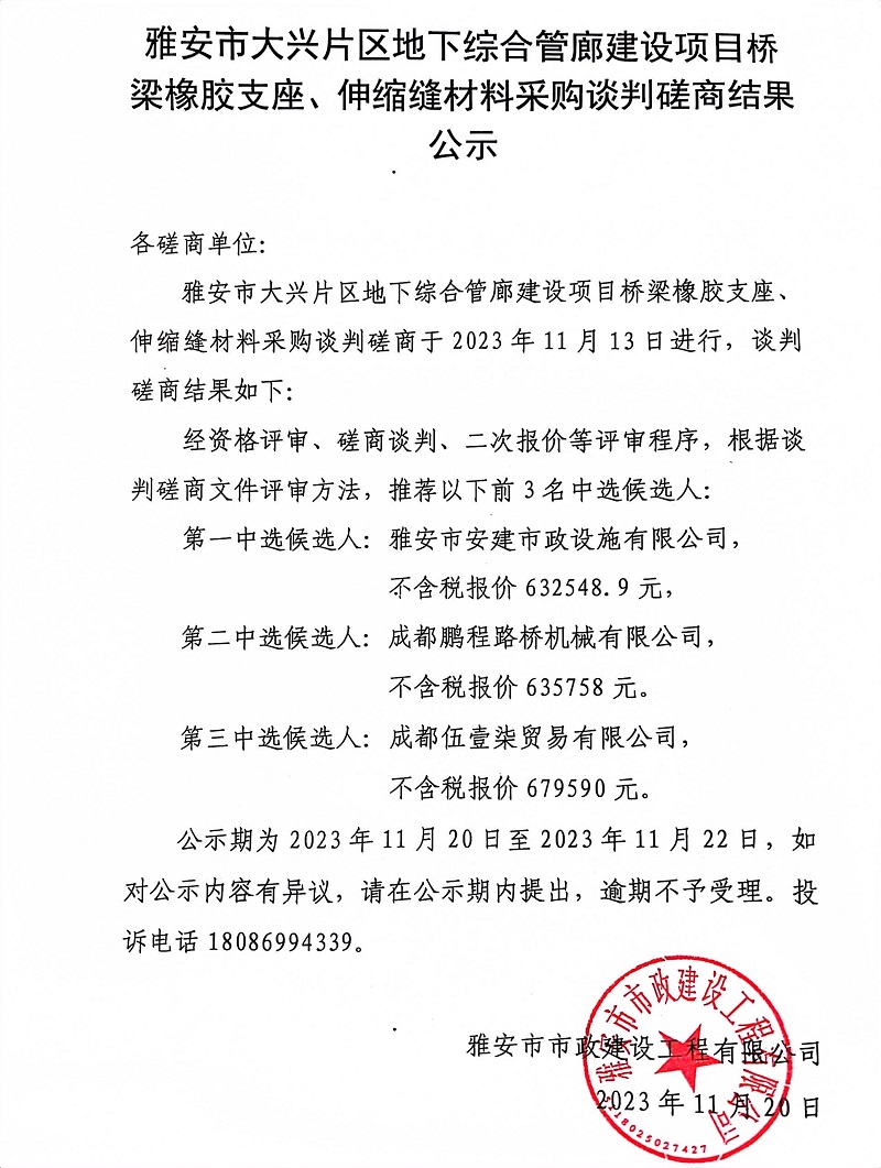 雅安市大興片區(qū)地下綜合管廊建設項目橋梁橡膠支座、伸縮縫材料采購談判磋商結(jié)果公示