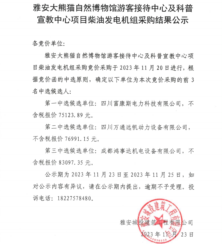 雅安大熊貓自然博物館游客接待中心及科普宣教中心項(xiàng)目柴油發(fā)電機(jī)組采購結(jié)果公示