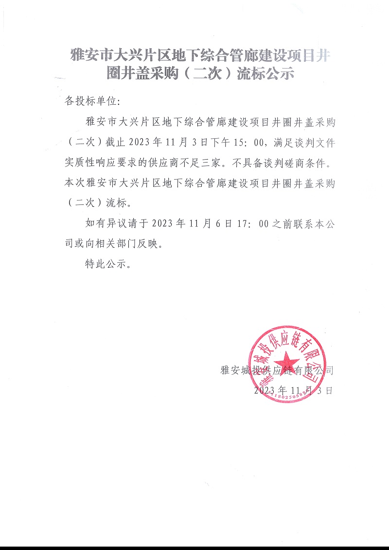 雅安市大興片區(qū)地下綜合管廊建設(shè)項目井圈井蓋采購(二次)流標公示