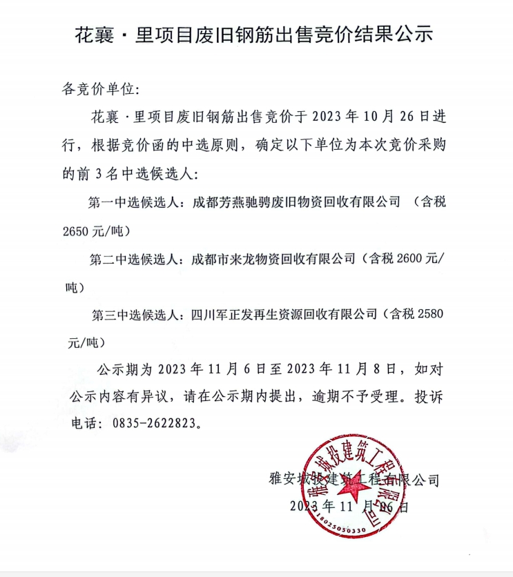 花襄·里廢舊鋼筋出售競(jìng)價(jià)結(jié)果公示