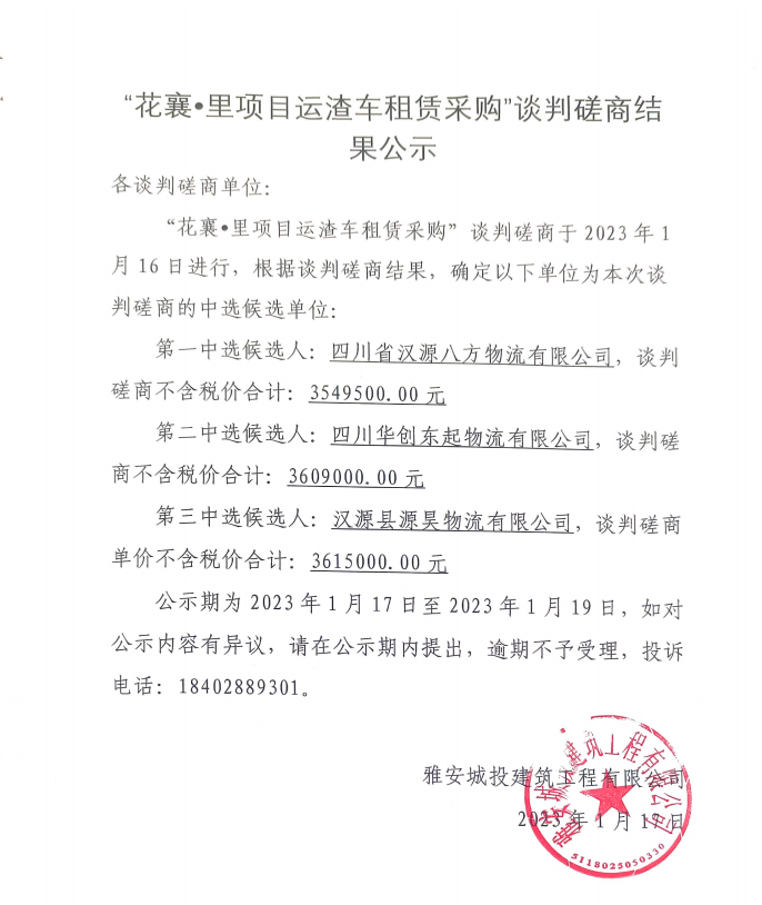 花襄·里項(xiàng)目運(yùn)渣車(chē)租賃采購(gòu)談判磋商結(jié)果公示