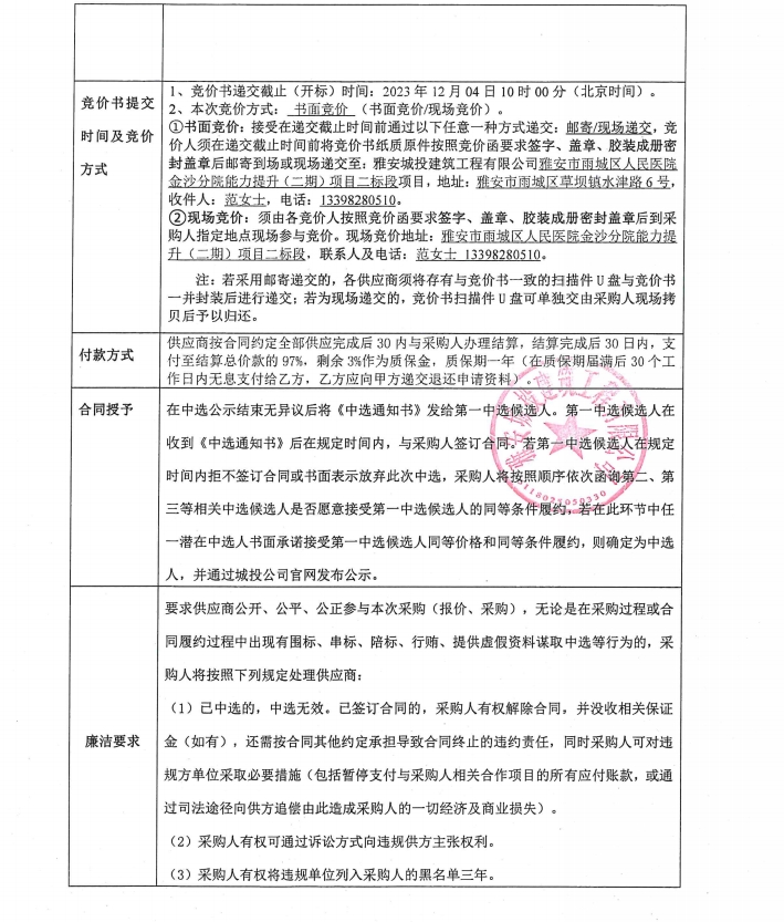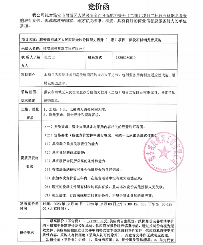 雅安市雨城區(qū)人民醫(yī)院金沙分院能力提升(二期)項目二標段石材鋼龍骨采購競價公告