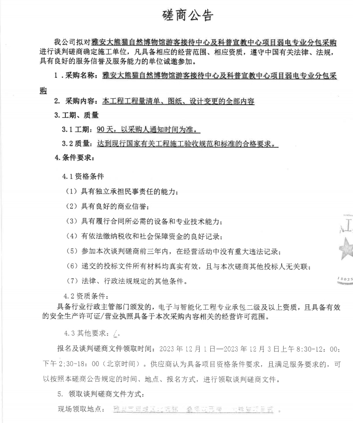 雅安大熊貓自然博物館游客接待中心及科普宣教中心項(xiàng)目弱電專業(yè)分包采購談判磋商公告