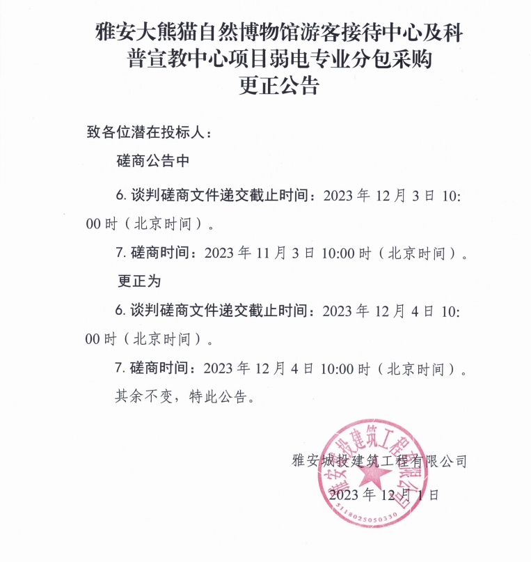 雅安大熊貓自然博物館接待中心及科普宣教中心項(xiàng)目弱電專(zhuān)業(yè)分包采購(gòu)更正公告