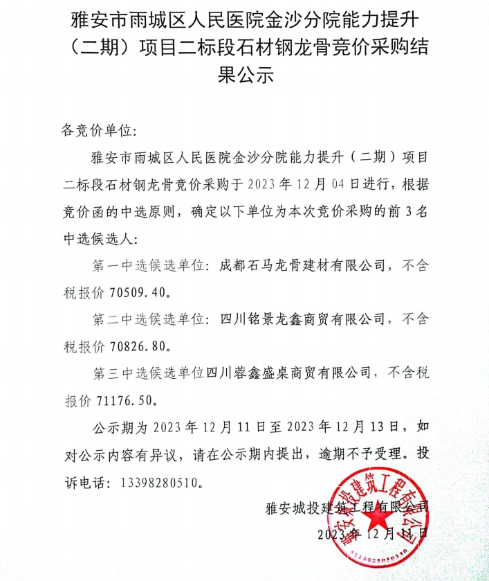 雅安市雨城區(qū)人民醫(yī)院金沙分院能力提升(二期)項(xiàng)目二標(biāo)段石材鋼龍骨采購(gòu)競(jìng)價(jià)采購(gòu)結(jié)果公示
