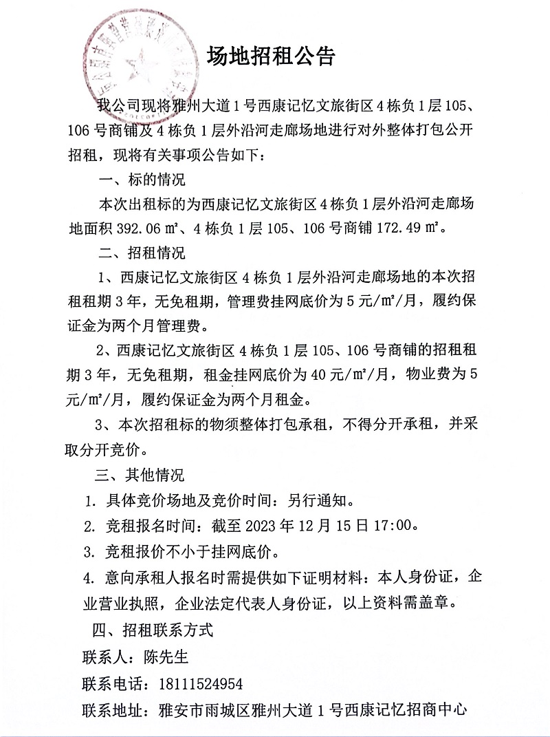 雅州大道1號西康記憶文旅街區(qū)4棟負(fù)1層105、106號商鋪及4棟負(fù)1層外沿河走廊場地招租公告