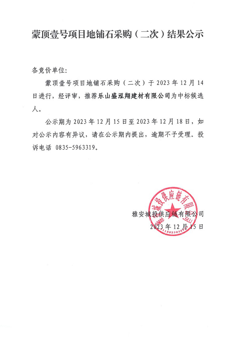 蒙頂壹號(hào)項(xiàng)目地鋪石采購(gòu)(二次)結(jié)果公示