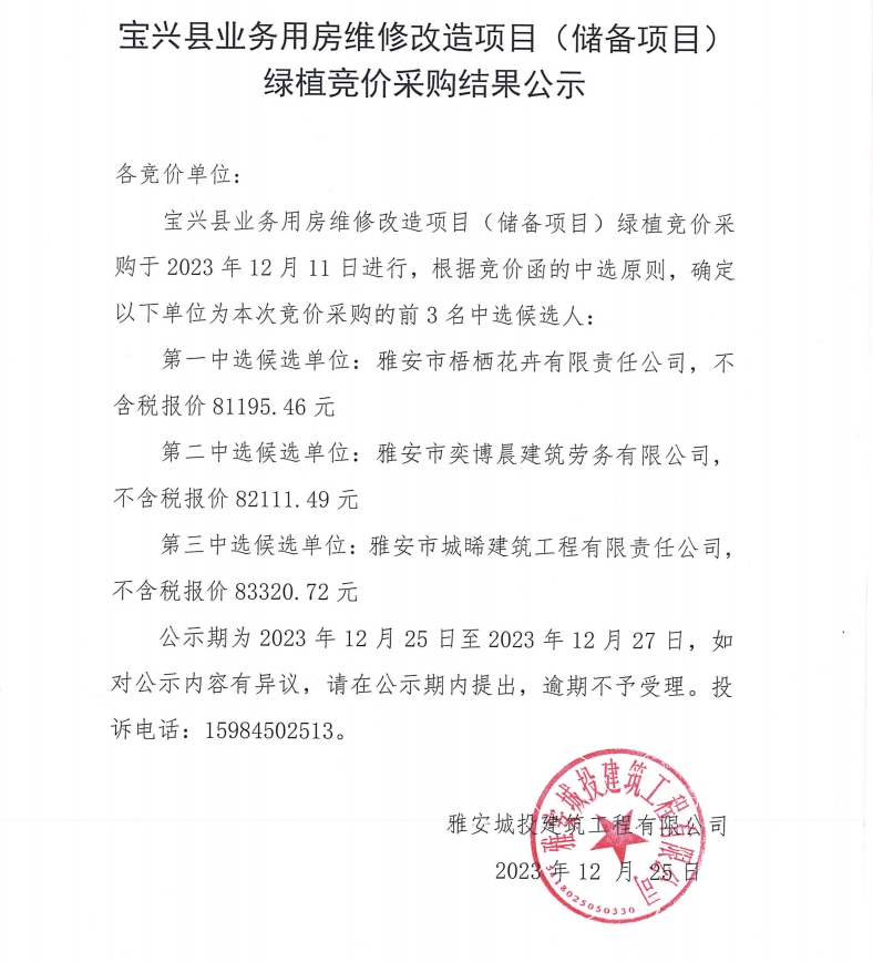 寶興縣業(yè)務(wù)用房維修改造項(xiàng)目(儲(chǔ)備項(xiàng)目)綠植競(jìng)價(jià)采購(gòu)結(jié)果公示