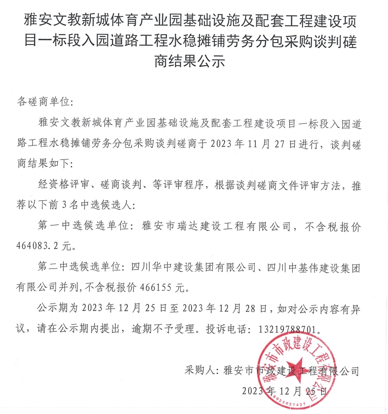 雅安文教新城體育產(chǎn)業(yè)園基礎(chǔ)設(shè)施及配套工程建設(shè)項(xiàng)目一標(biāo)段入園道路工程水穩(wěn)攤鋪勞務(wù)采購談判磋商結(jié)果公示