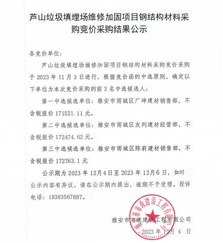 蘆山垃圾填埋場維修加固項目鋼結構材料采購競價采購結果公示