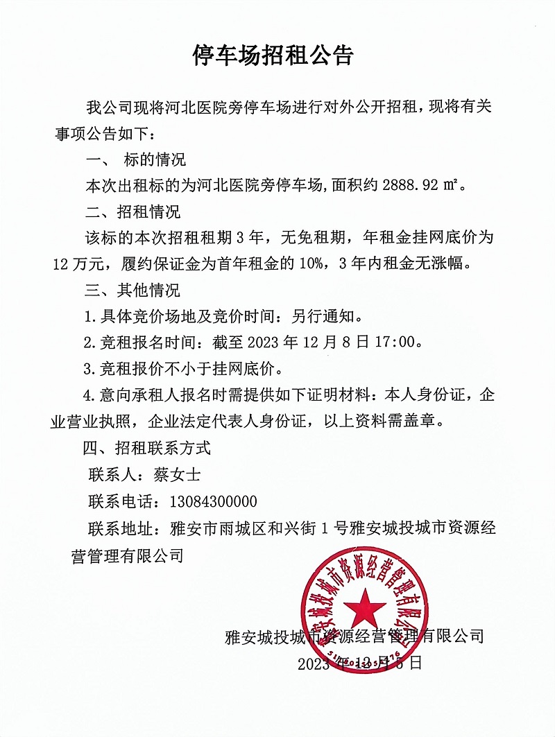 河北醫(yī)院旁停車場(chǎng)招租公告