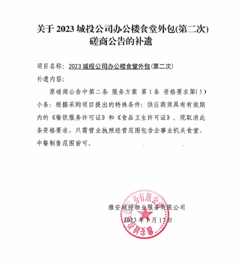 關(guān)于2023城投公司辦公樓食堂外包(第二次)項(xiàng)目競爭磋商公告補(bǔ)遺