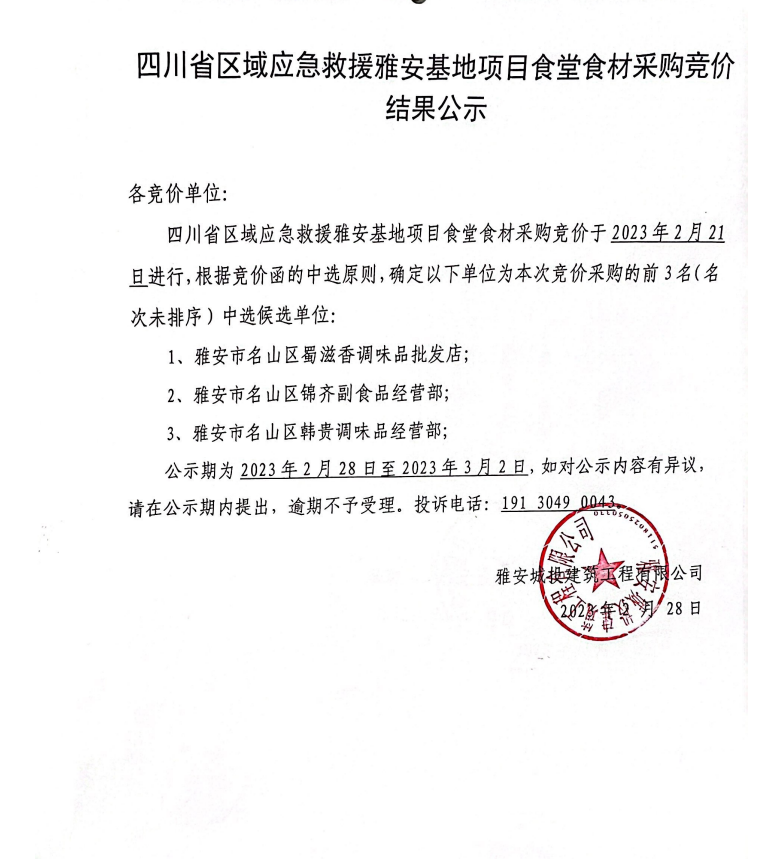 四川省區(qū)域應急救援雅安基地項目食堂食材采購競價結(jié)果公示