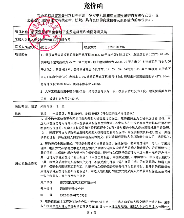 蒙頂壹號(hào)項(xiàng)目整套地下室發(fā)電機(jī)組和墻面降噪采購(gòu)競(jìng)價(jià)公告