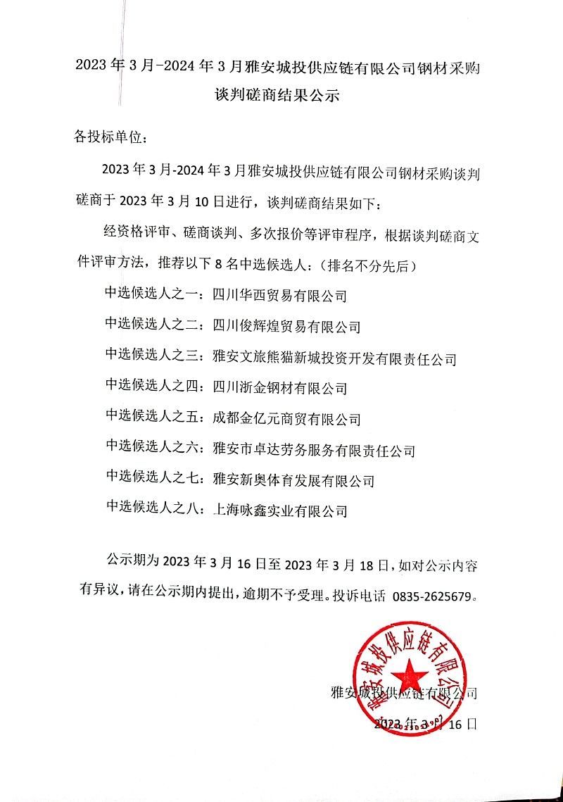 2023年3月-2024年3月雅安城投供應(yīng)鏈有限公司鋼材采購(gòu)談判磋商結(jié)果公示