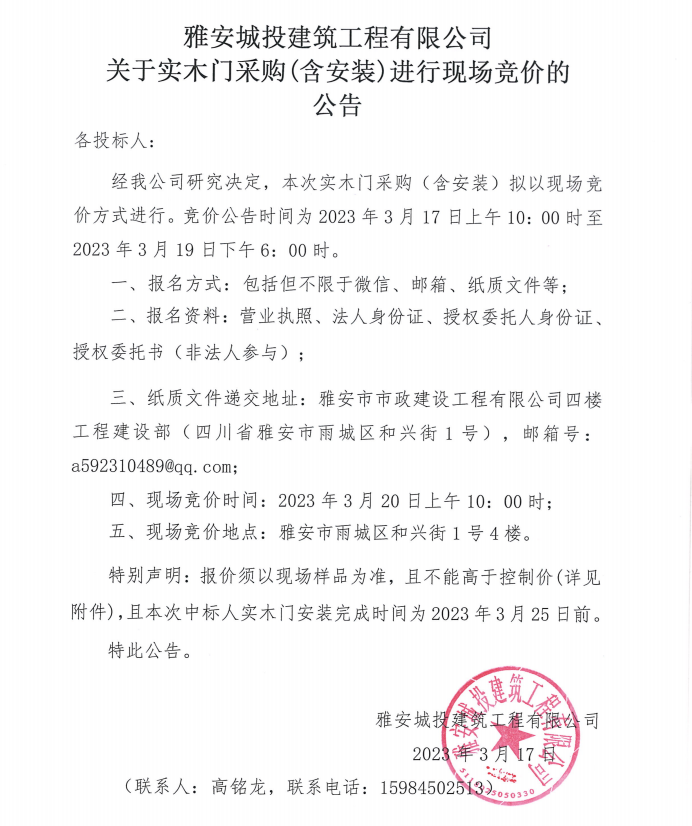 雅安城投建筑工程有限公司關(guān)于實(shí)木門(mén)采購(gòu)(含安裝)進(jìn)行現(xiàn)場(chǎng)競(jìng)價(jià)的公告