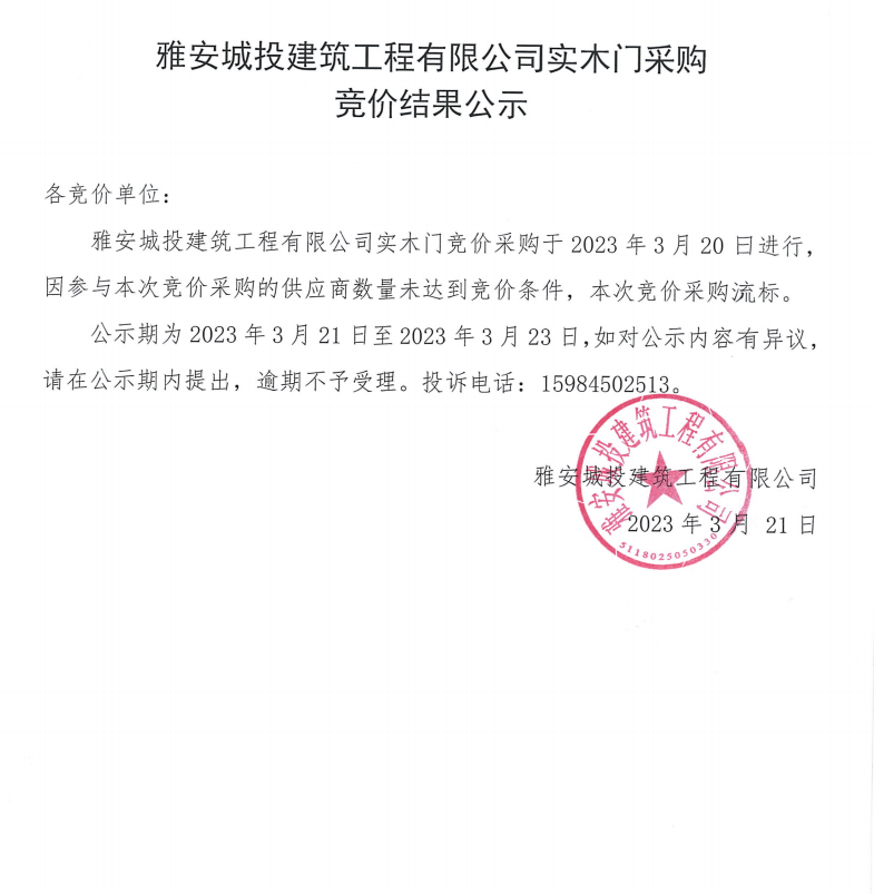 雅安城投建筑工程有限公司實(shí)木門采購(gòu)競(jìng)價(jià)結(jié)果公示