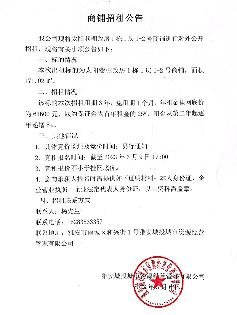 太陽巷棚改房1棟1層1-2號(hào)商鋪招租公告