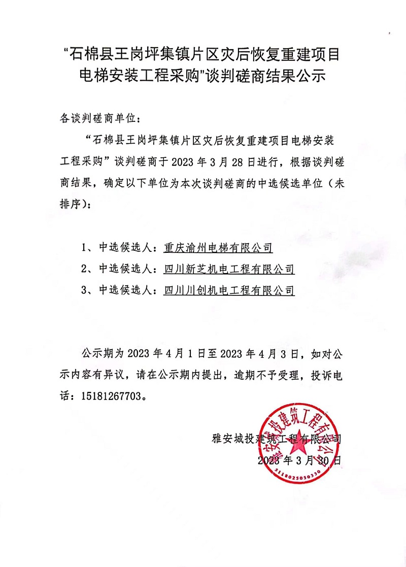 “石棉縣王崗坪集鎮(zhèn)片區(qū)災后恢復重建項目電梯安裝工程采購”談判磋商結(jié)果公示
