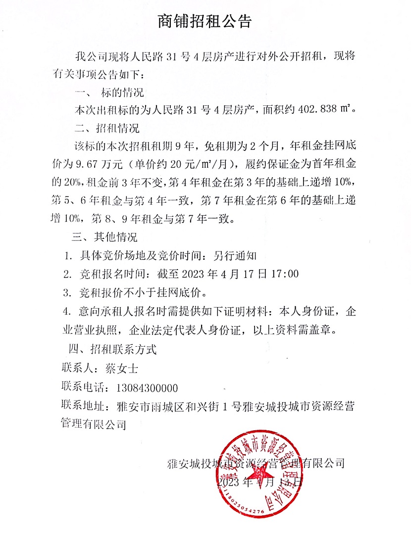 人民路31號4層房產(chǎn)商鋪招租公告