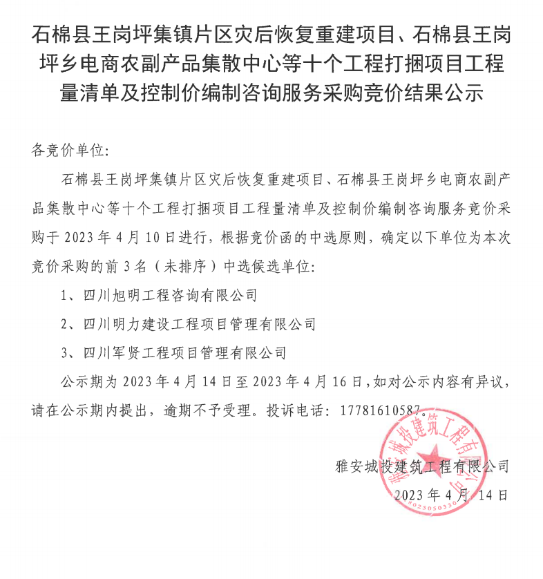 石棉縣王崗坪集鎮(zhèn)片區(qū)災后恢復重建項目、石棉縣王崗坪鄉(xiāng)電商農(nóng)副產(chǎn)品集散中心等十個工程打捆項目工程量清單及控制價編制咨詢服務采購競價結(jié)果公示