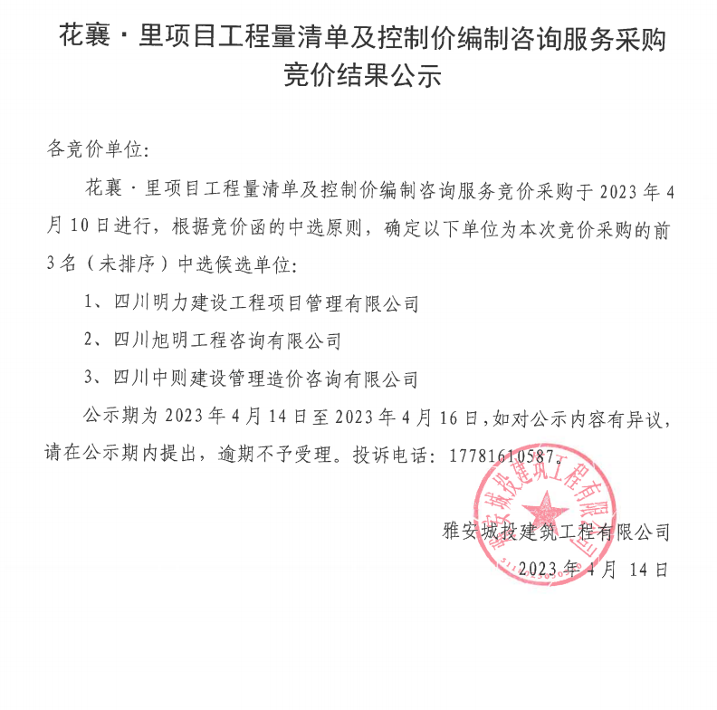 花襄·里項(xiàng)目工程量清單及招標(biāo)控制價(jià)編制咨詢服務(wù)采購(gòu)競(jìng)價(jià)結(jié)果公示