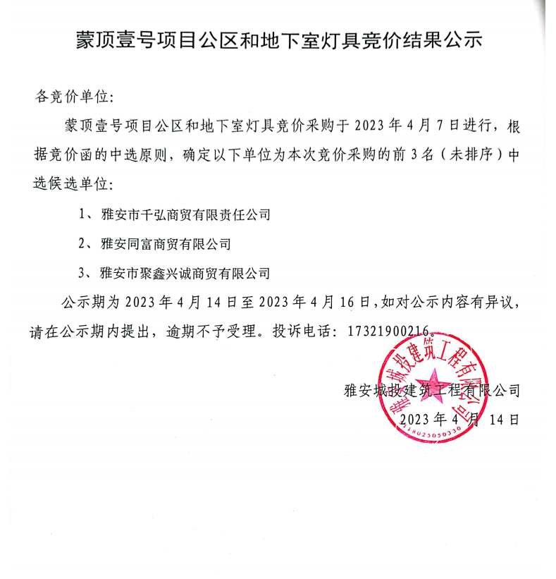 蒙頂壹號項目公區(qū)和地下室燈具競價結(jié)果公示