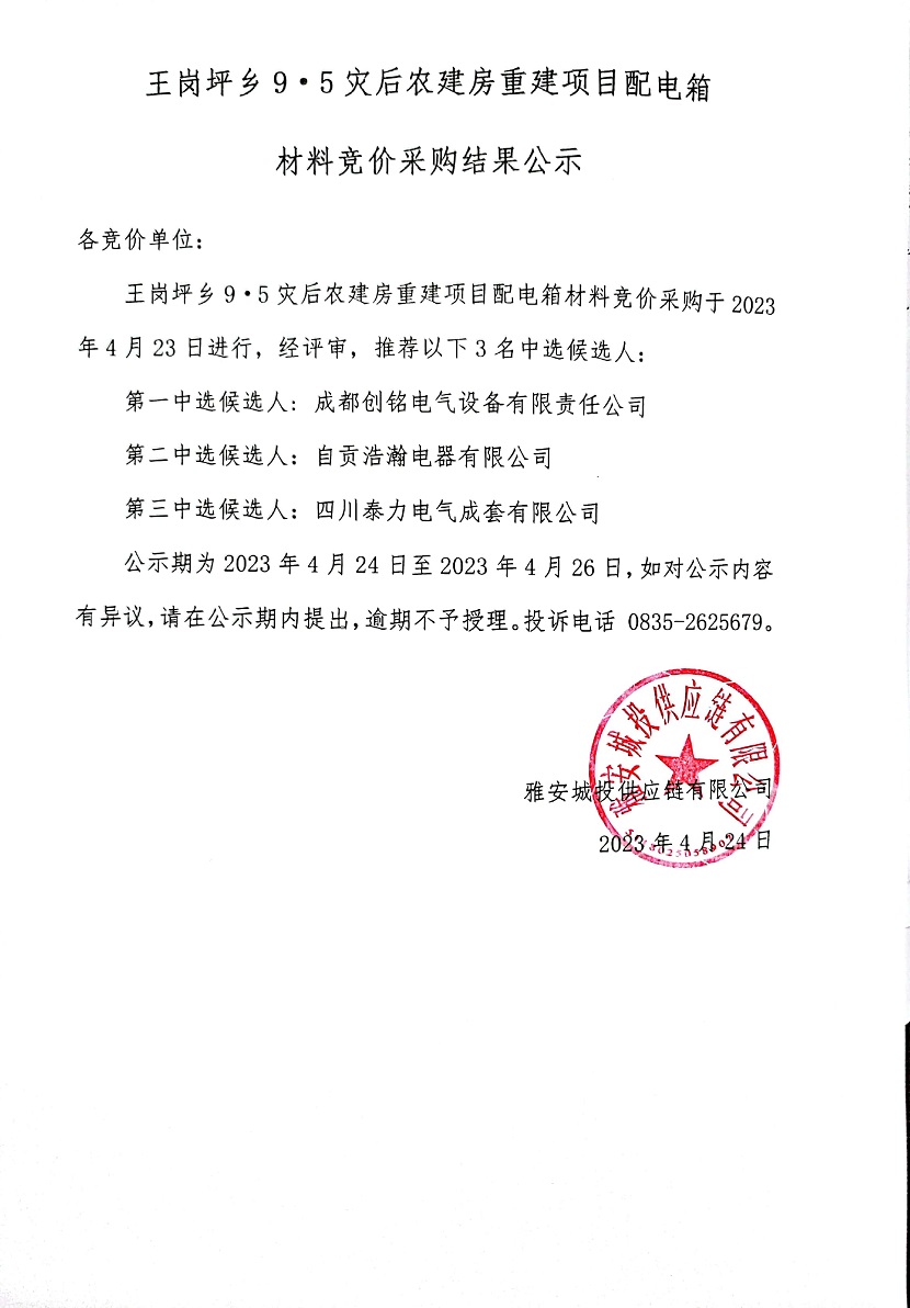 王崗坪鄉(xiāng)9·5災(zāi)后農(nóng)建房重建項(xiàng)目配電箱材料競(jìng)價(jià)采購(gòu)結(jié)果公示